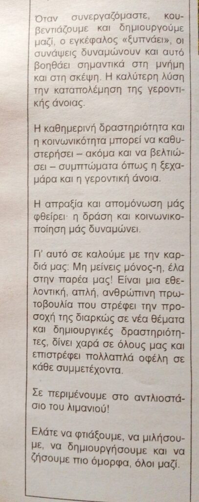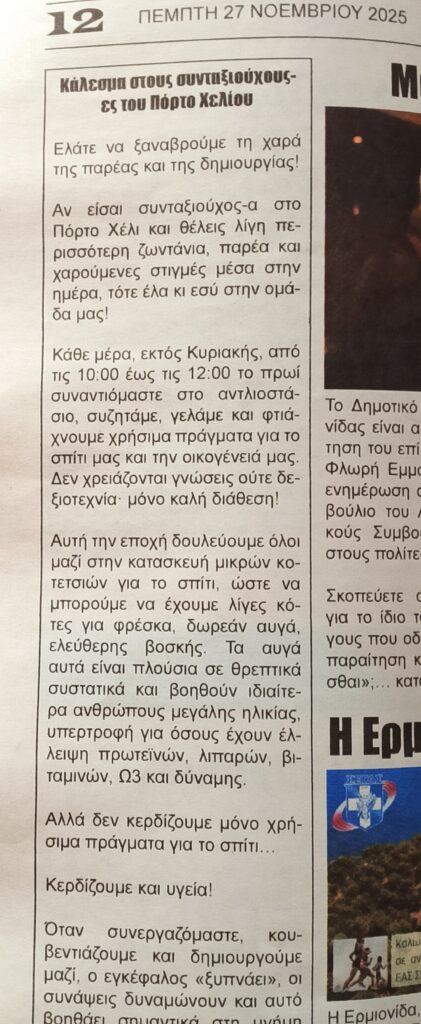 Αν είσαι συνταξιούχος-α στο Πόρτο Χέλι και θέλεις λίγη περισσότερη ζωντάνια, παρέα και χαρούμενες στιγμές μέσα στην ημέρα, τότε έλα κι εσύ στην ομάδα μας!